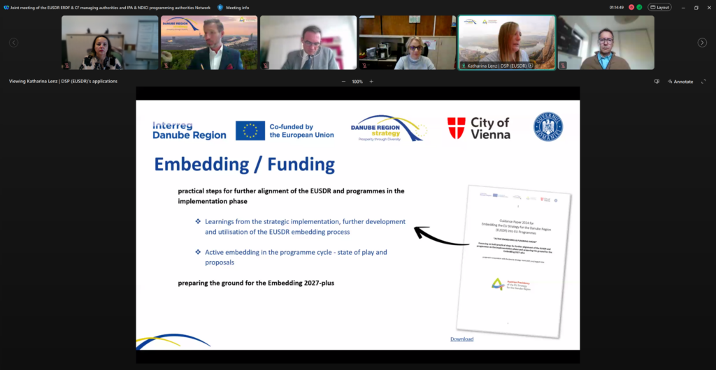 Austrian EUSDR Presidency and the Danube Strategy Point prepared the Embedding Guidance Paper 2024, titled “Active Embedding & Planning Ahead”. The paper outlines practical steps for the further alignment of the EUSDR and funding programmes in the current implementation phase. Secondly, it contributes to the discussion on embedding post-2027. Building on specific experiences in Austria in working on embedding with Interreg programmes, a focus is given to the question of how to build embedding links between the EUSDR and the Interreg programmes. Therefore, ‘active embedding’ steps from the EUSDR – what the Strategy can offer to programmes – are analysed in the Guidance Paper 2024 based on the (Interreg) programme cycle. In addition, an alignment of existing activities and proposals developed for concrete active involvement in the various areas of the (Interreg transnational/CBC) programme cycle that go beyond the EUSDR were presented.